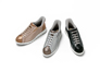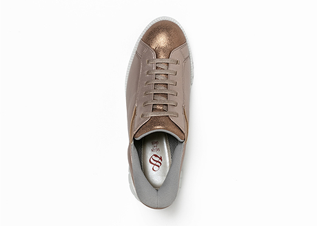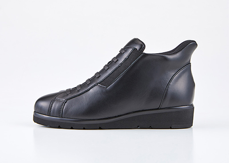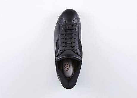 伸縮性のある紐使いや足入れしやすい機能付きのレザースニーカー。
