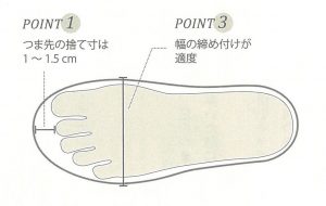 婦人靴の場合、靴のつま先に1~1.5cm程度のゆとり(捨て寸)が必要です。